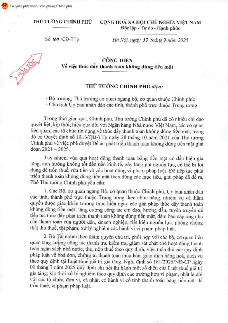 Công điện về thanh toán không dùng tiền mặt 15/08/2025, 10:09:35 - Lượt xem: 12 Tweet Thêm vào danh sách Báo xấu Thông tin tài liệu Công điện về thanh toán không dùng tiền mặt